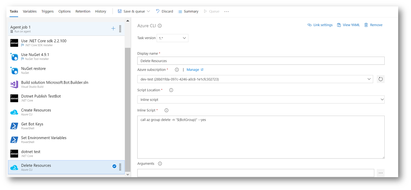5- After the Tests run, add a new Azure CLI Task to delete the resource group we've created in the third step.