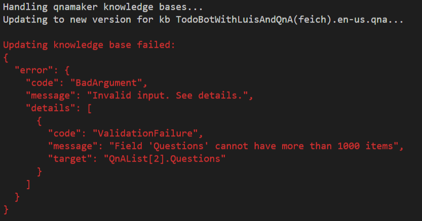 @vishwacsena, I added the logic to break the large QA pair into multiple smaller ones in cross-train. I figured out that the limit of question number for an answer in replace API seems to be 1000 instead of 300. I tested that manully, if question number is over 1000, like 1001, it will throw error like below. Number no more than 1000 will work well. Unit tests are also added for the split logic. I also fixed the logic to throw out the errors from API. Now it can throw any API call failures to console like above screenshot. |