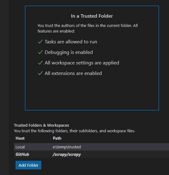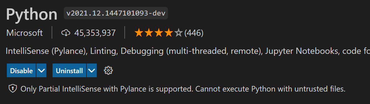 @karrtikr I tested virtual workspace as well (with GitHub Repositories extension), mostly it works as expected. but internally, there seems some stuff Pylance need to sort out (mostly around uri and file system access) but end user experience seems mostly what we would expect. except one thing. even in virtual workspace scenario, trusted workspace concept seems to apply as you can see below that I can make trusted and status bar change to this I am not sure what it meant to be trusted in virtual workspace environment. usually trusted means not file access but permission to execute exe (ex, python). are we going to let user to choose python (including venv) that are installed on local machine with virtual workspace? code seems doesn't care about virtual workspace when passing python path though but only care about whether it is trusted or not. (and vscode code seems let user to trust virtual workspace). |