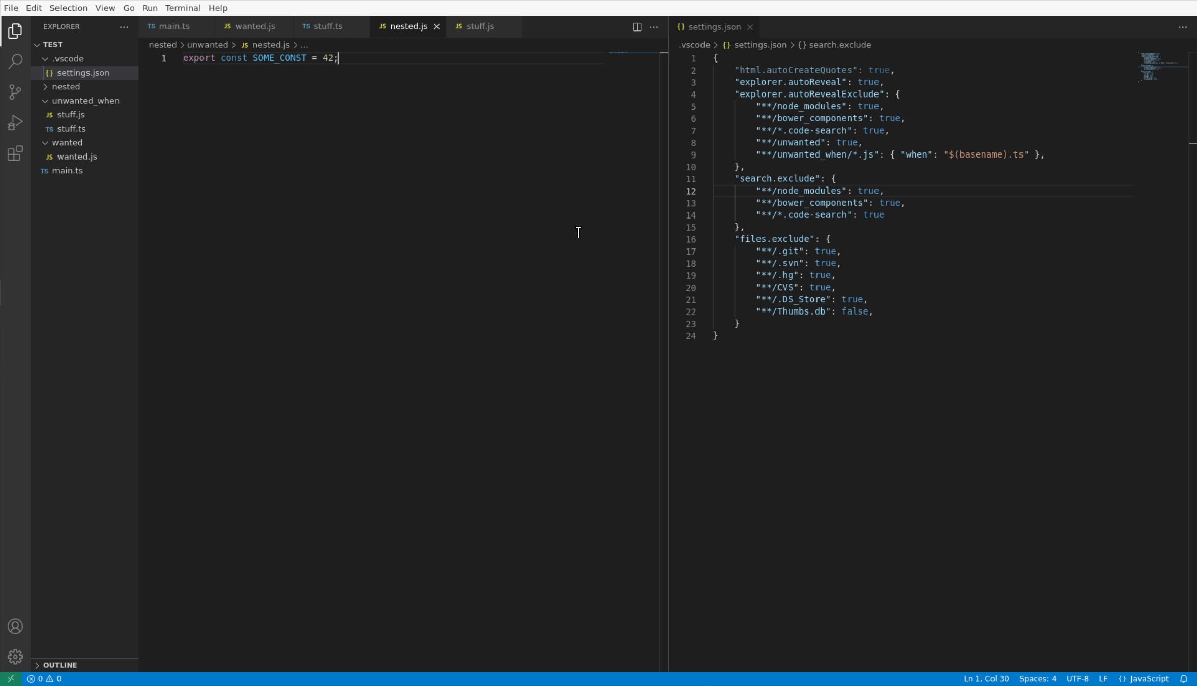 The explorer will show files in Then I access a file in there by some way (Ctrl+ P or if it was imported etc): @isidorn makes a point that it wouldn't be obvious to users unless they find the setting description so that can be removed and users can add back what they want. I can remove the sibling support if required, but wouldn't it be useful to have? It doesn't interfere with the normal glob functionality and can be useful such as wanting to check a compiled JS file but having it revealed if a TS file exists with the same name in that folder. |