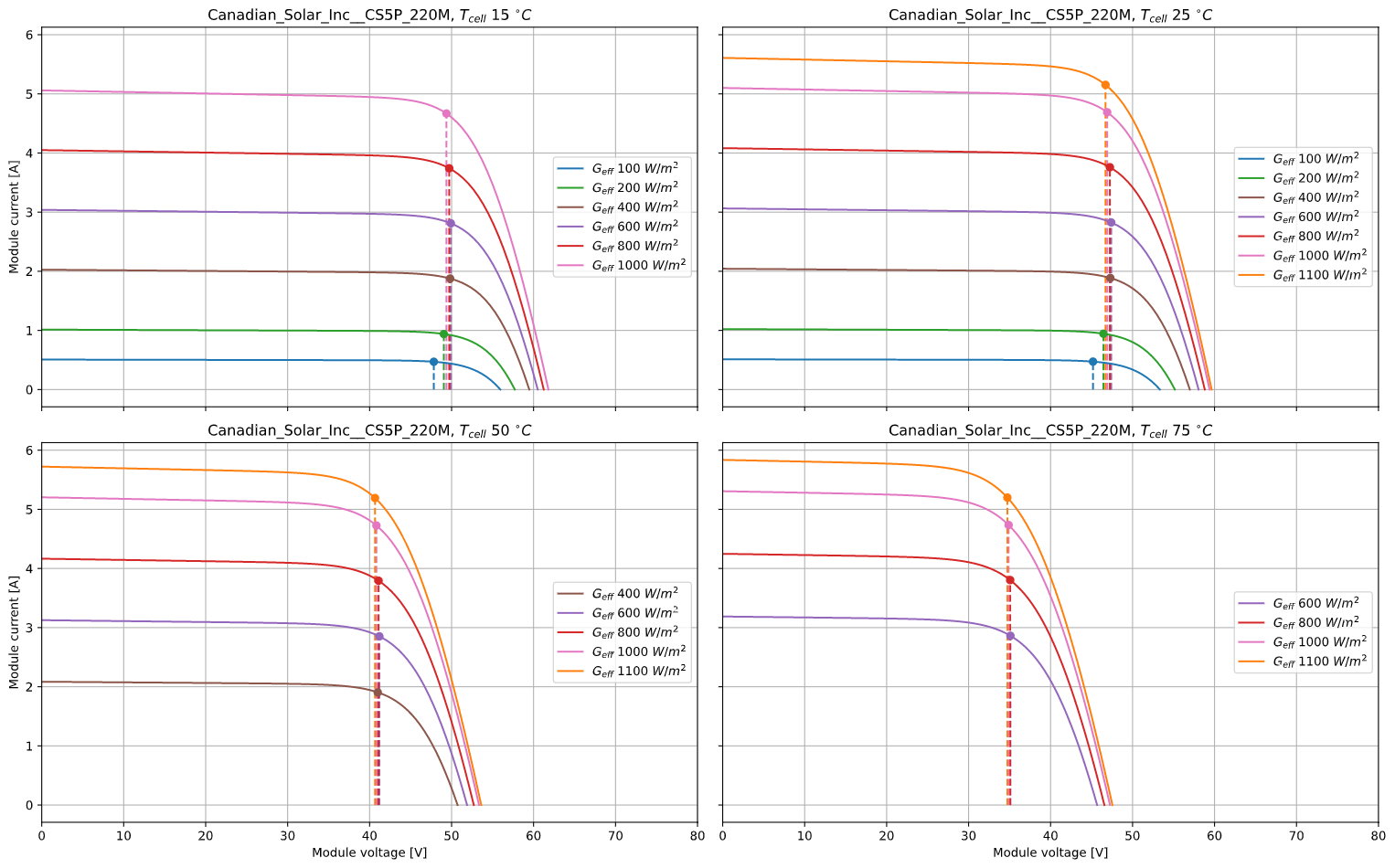 I like this comparison of IV curves. There's a lot going on though, and maybe the eye doesn't know where to start -- what do you think about using color as a guide to the eye for comparing curves at the same irradiance between plots? For example right now in the upper left plot blue currently means 100 W/m2 but in the upper right it means 400 W/m2. Maybe also sharey=True in plt.subplots?
