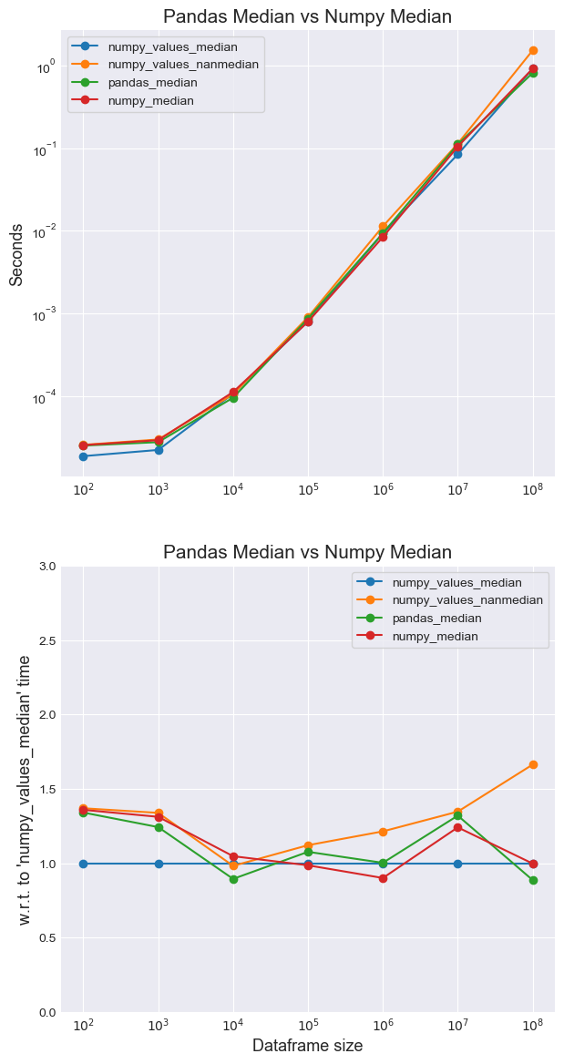 - The first subplot shows the average time it has taken each function to run against different dataframe sizes. Note that this is a semilog plot, i.e. the y-axis is shown in log scale.