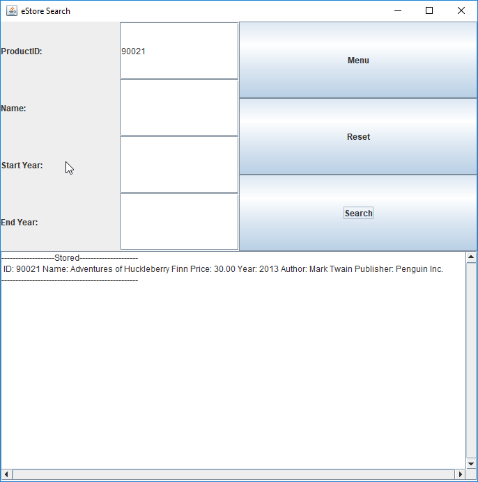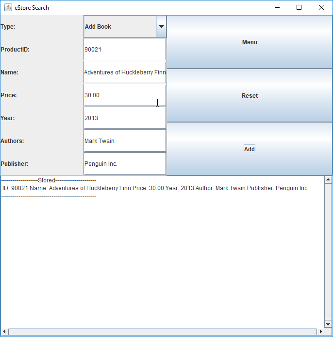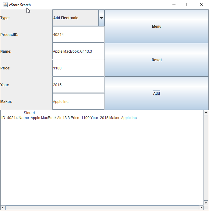 For electronics, the user must enter the product ID, Name, Price, Year. If the product being added is a book the author and publisher can also be included. Defensive programming is used to prevent duplicates or anyother invalid entries. The size of the buttons and text fields will scale to the size of the window.