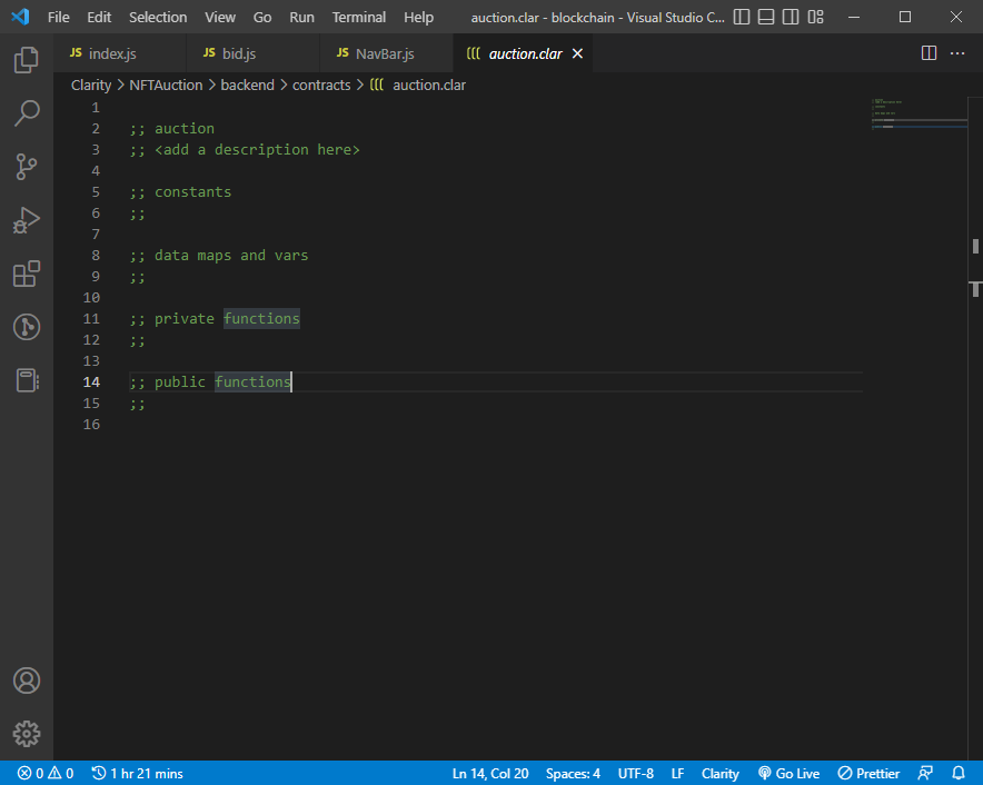 clarinet contract new auctionThis creates an auction.clar file in the contract folder. If we go into our NFTAuction/backend/contracts we would see