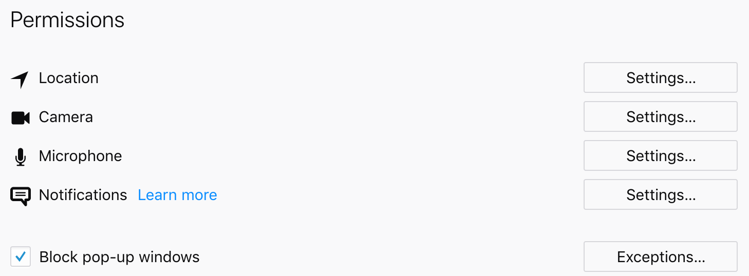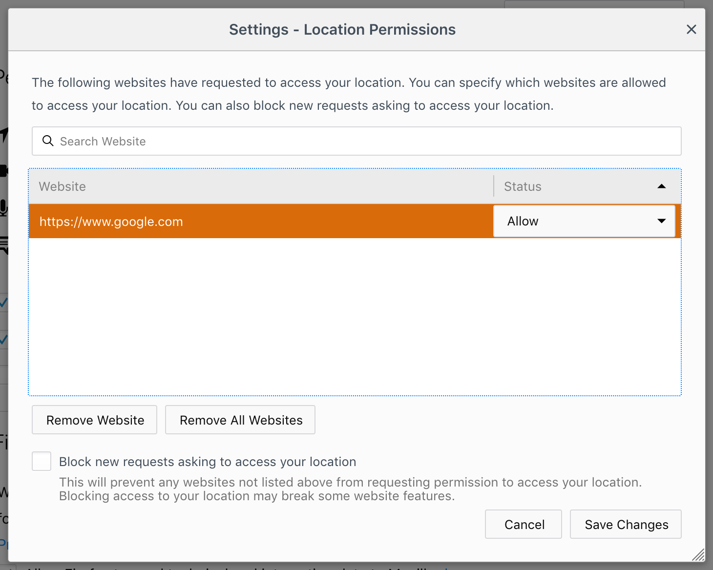 I want to be able to open up a Permissions Manager screen where I can see all the permissions that I have granted to websites. I would also like to be able to change the permission (Ask, Always, Deny) or to completely remove the website so that I will be asked again next time I visit the website.