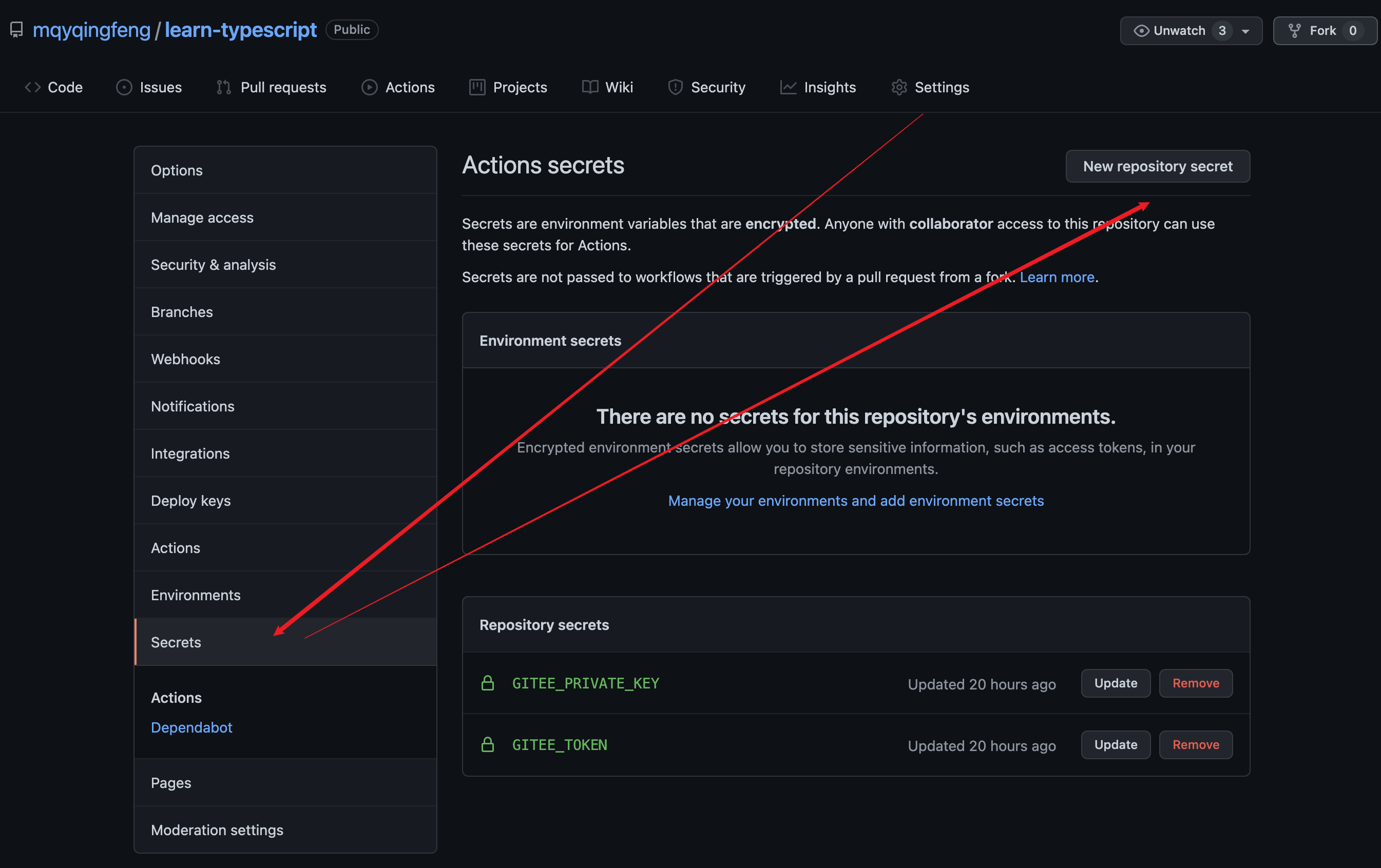 复制私钥内容,然后在要同步的 Github 仓库中,选择 "Setting" -> "Secrets" -> "New repository secret"