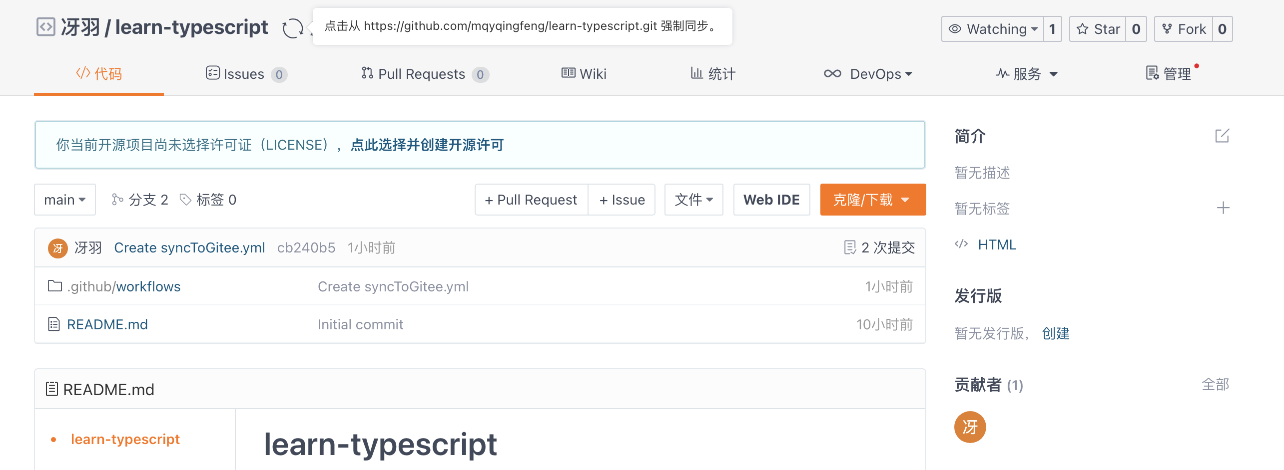 的时候,都是编译代码到 dist 目录,然后重新 git init ,最后强制提交。所以我们在项目的根目录建立.github/woorkflows/syncToGitee.yml
