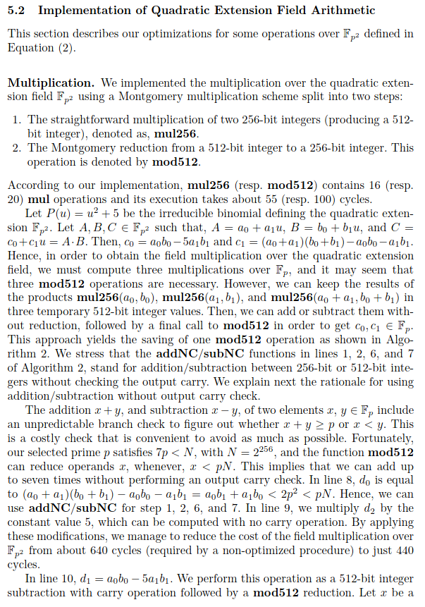 In particular 3x25 cycles are gained on mul and 2x10 cycles are lost on mod which makes single-width more interesting at least for Fp2 mul.