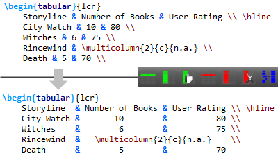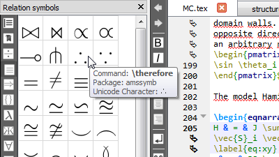 Suggests possible LaTeX commands as you type. There is a tooltip help explaining the command.