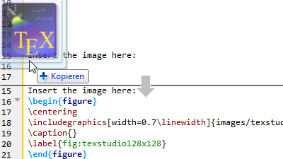 When you drag an image on the editor the image assistant opens. From there it's just one more click to have the code for the image inclusion. Of course, we try to make the paths relative. This also works with multiple images.