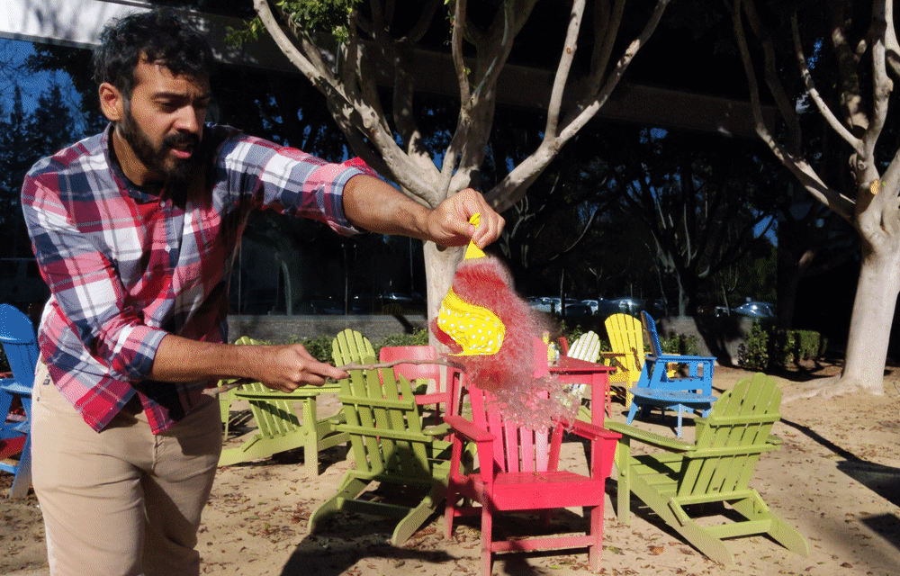 Five smartphones synchronously capture a balloon filled with red water being popped to within 250 μs timing accuracy.