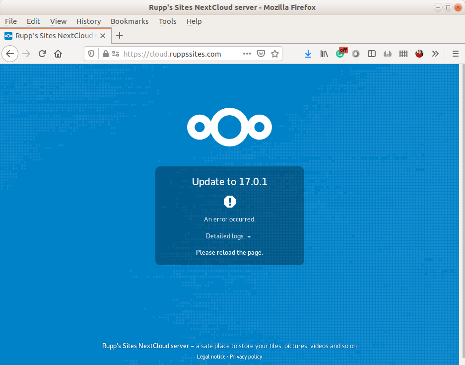 Nextcloud version: It won't load, but probably 17.0.1 right now, or almost there.