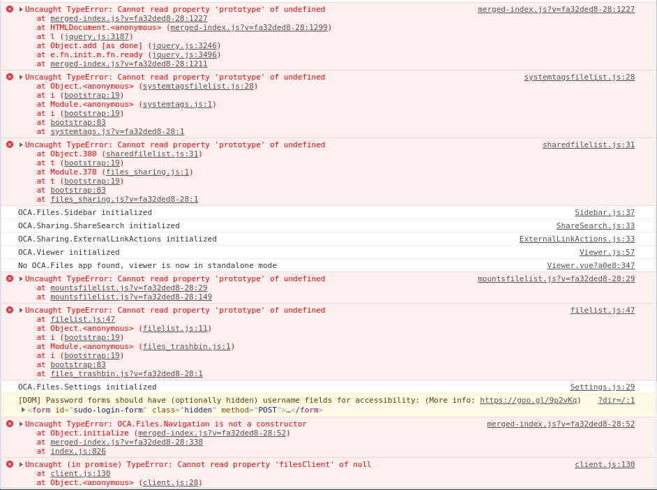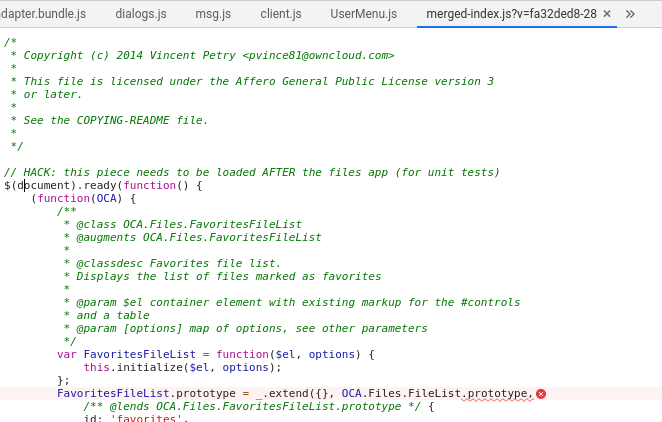 There actually seems to be a regression with this that causes the files app to fail loading (sometimes on firefox but more often in chromium) It seems to be somehow related to the order how things are executed since the issue is mainly that the OCA.Files.FileList is not ready when the Any idea @ChristophWurst ? I couldn't find anything helpful in the 2.2 changelog. 😞 |