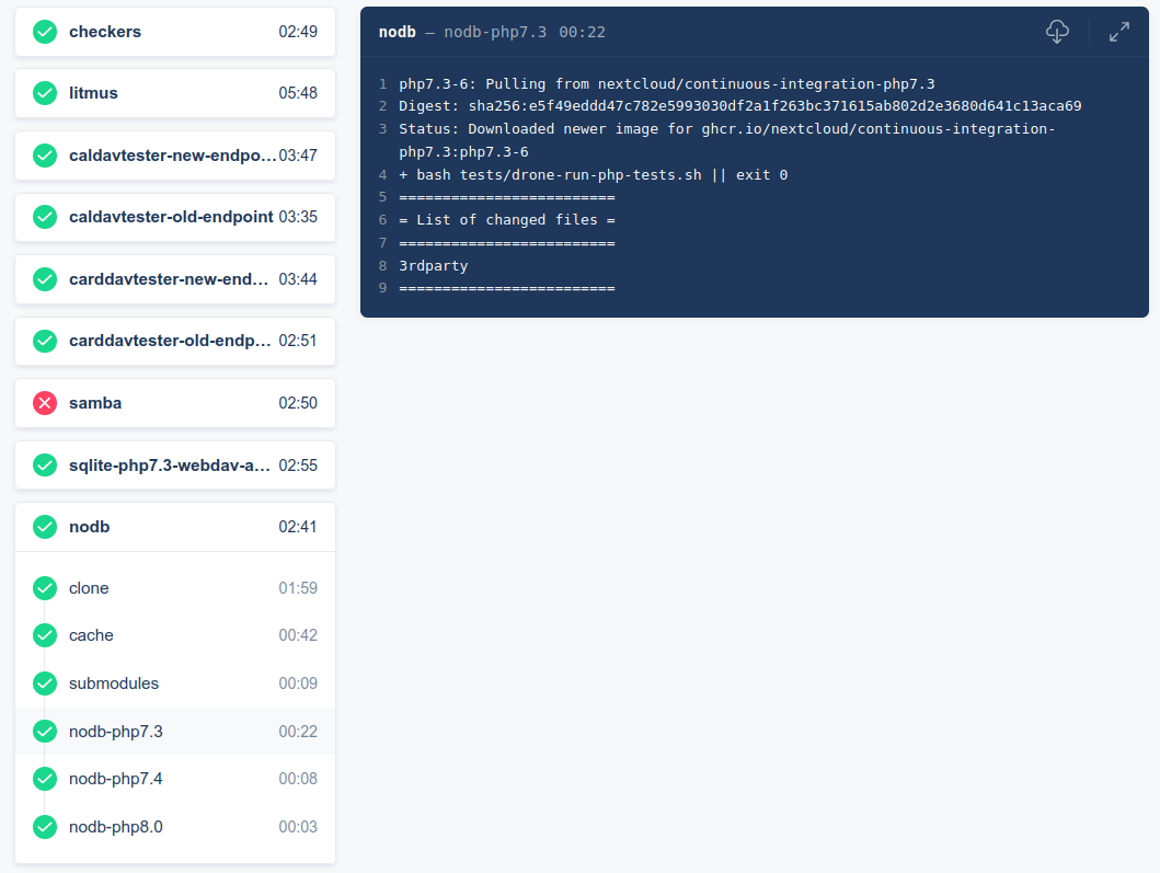 tests/drone-run-php-tests.shis there to reduce CI load a bit. The idea to skip for example the php tests when only vue/js is touched. Screenshot below is from a dependency update. As we don't have a check for 3rdparty the php tests are skipped and CI is happy. But we didn't run the unit tests for the dependency update 🙈Example to test the condition: