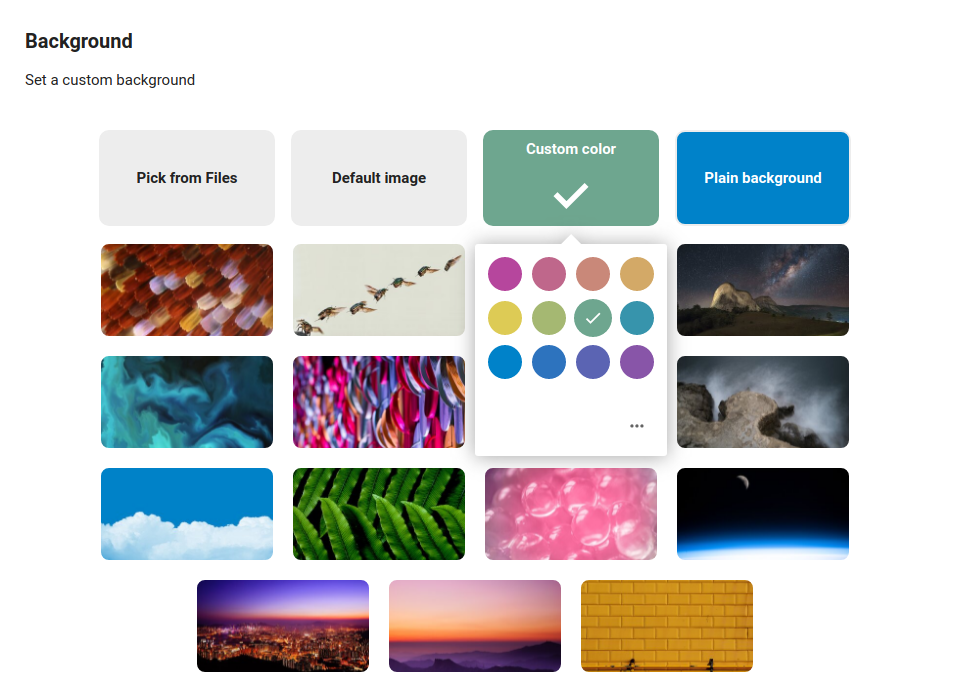 choosing a custom background, selecting a custom color removed the background again and enables the default theme again.