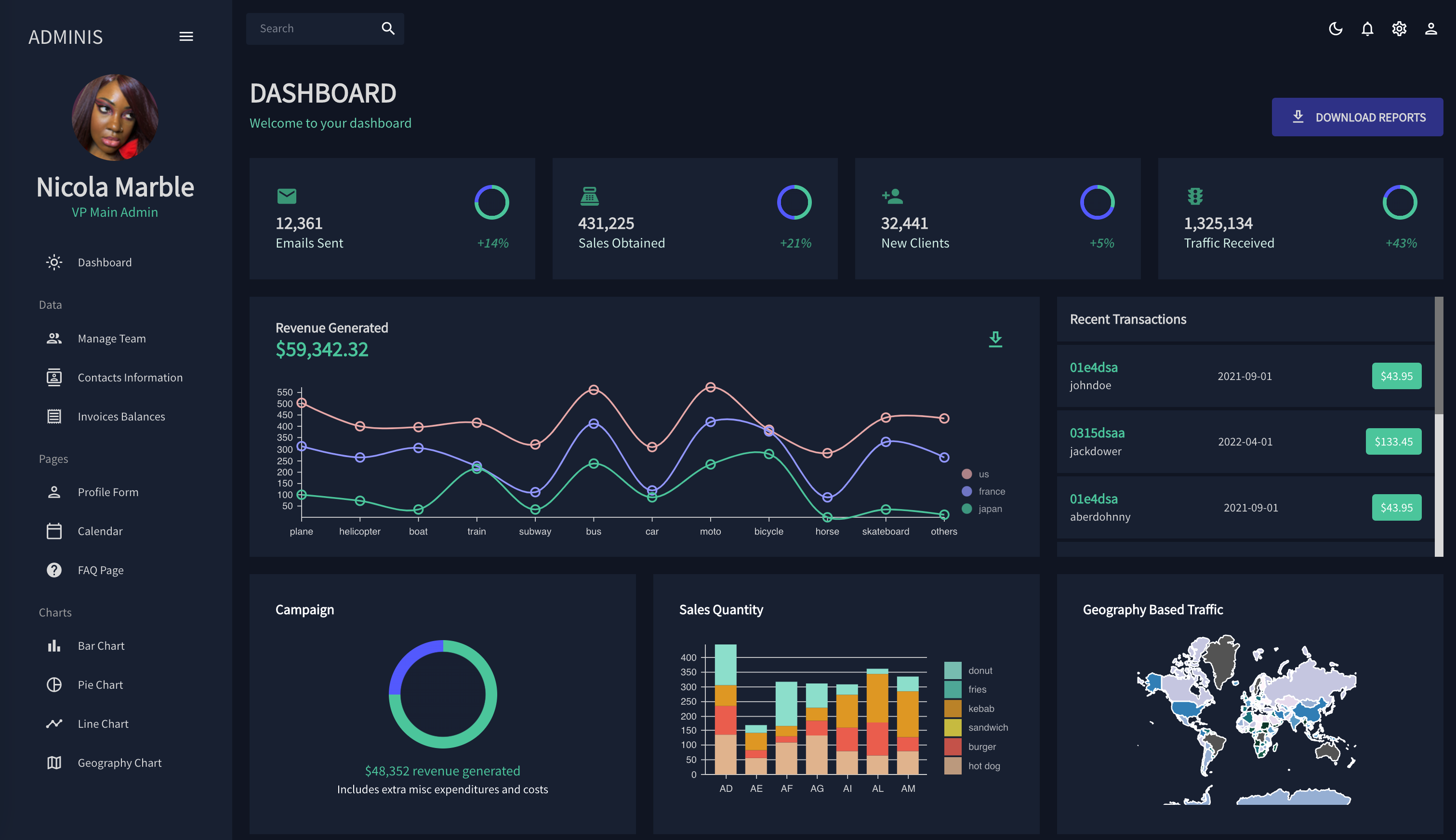 A front end demonstration of a dashboard for administrators. Managing data is an important part of any business practice. That data, however, can become difficult to understand without adequate visualizations. This application provides an interactive user experience to view and manipulate that data at first glance. This application even has a light and dark mode, to keep up with current industry trends. This application is best suited for desktop, but does provide a collapsable side-bar to allow more space to view the data.