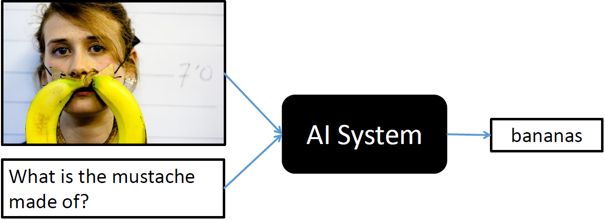Le Visual Question Answering (VQA) est une discipline informatique où la machine doit répondre à une question formée en langage naturel (et non pas en mots-clés) à propos d'une scène visuelle. L'entrée du modèle est donc une question et une image, la sortie est une classe qui correspond a un mot ou un groupe de mots (i.e. il existe la classe "pomme" et la classe "feu rouge").