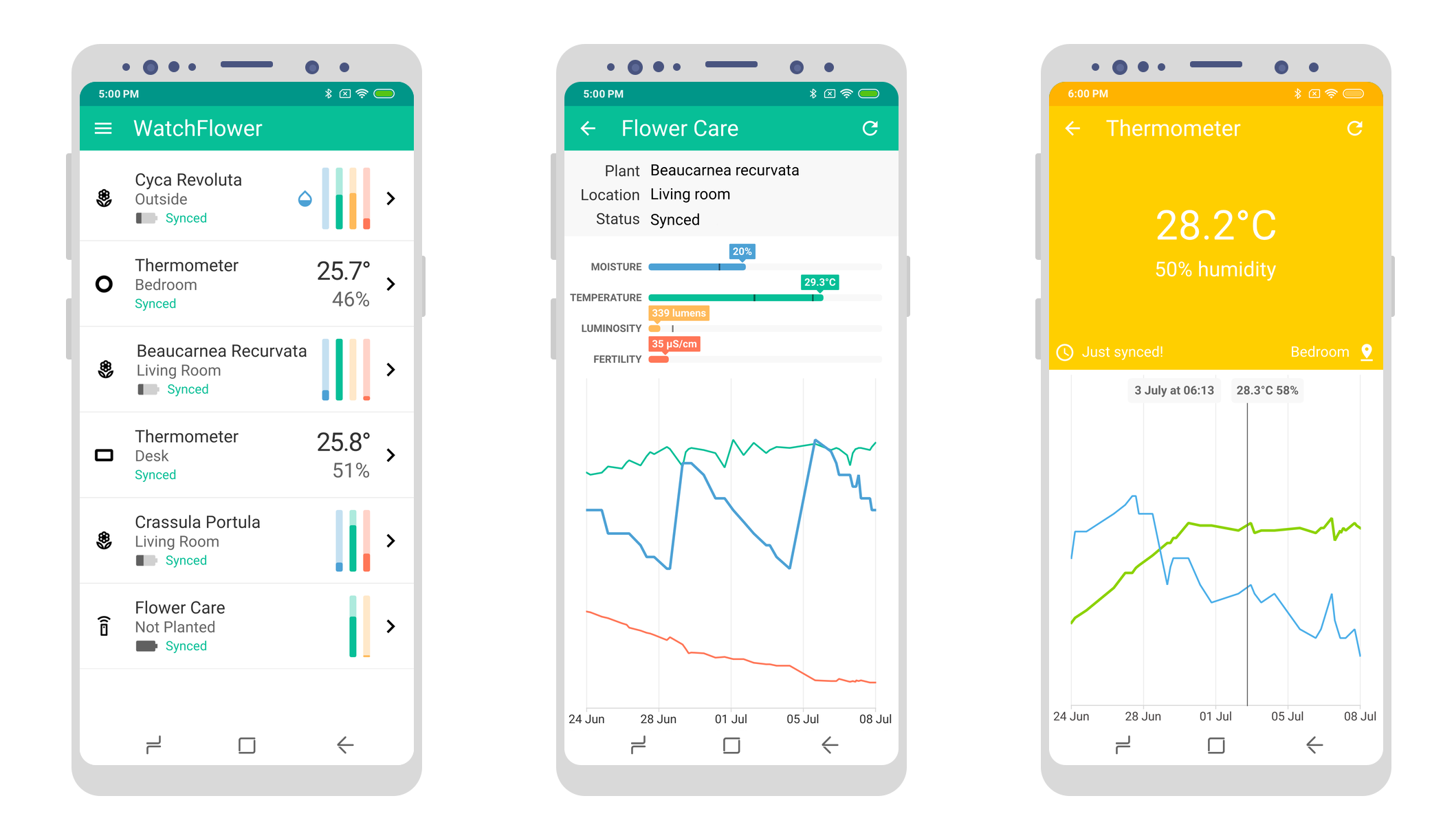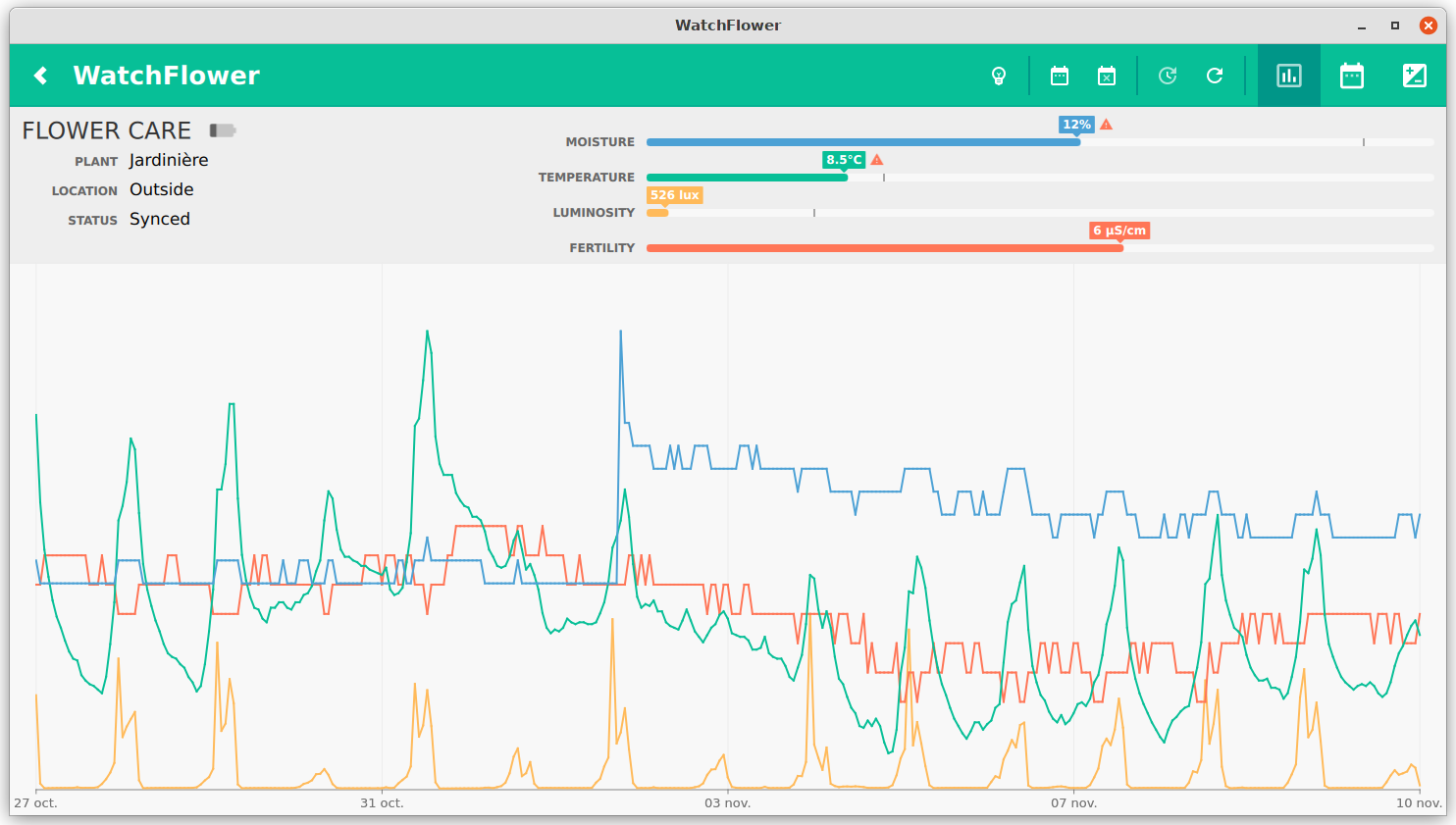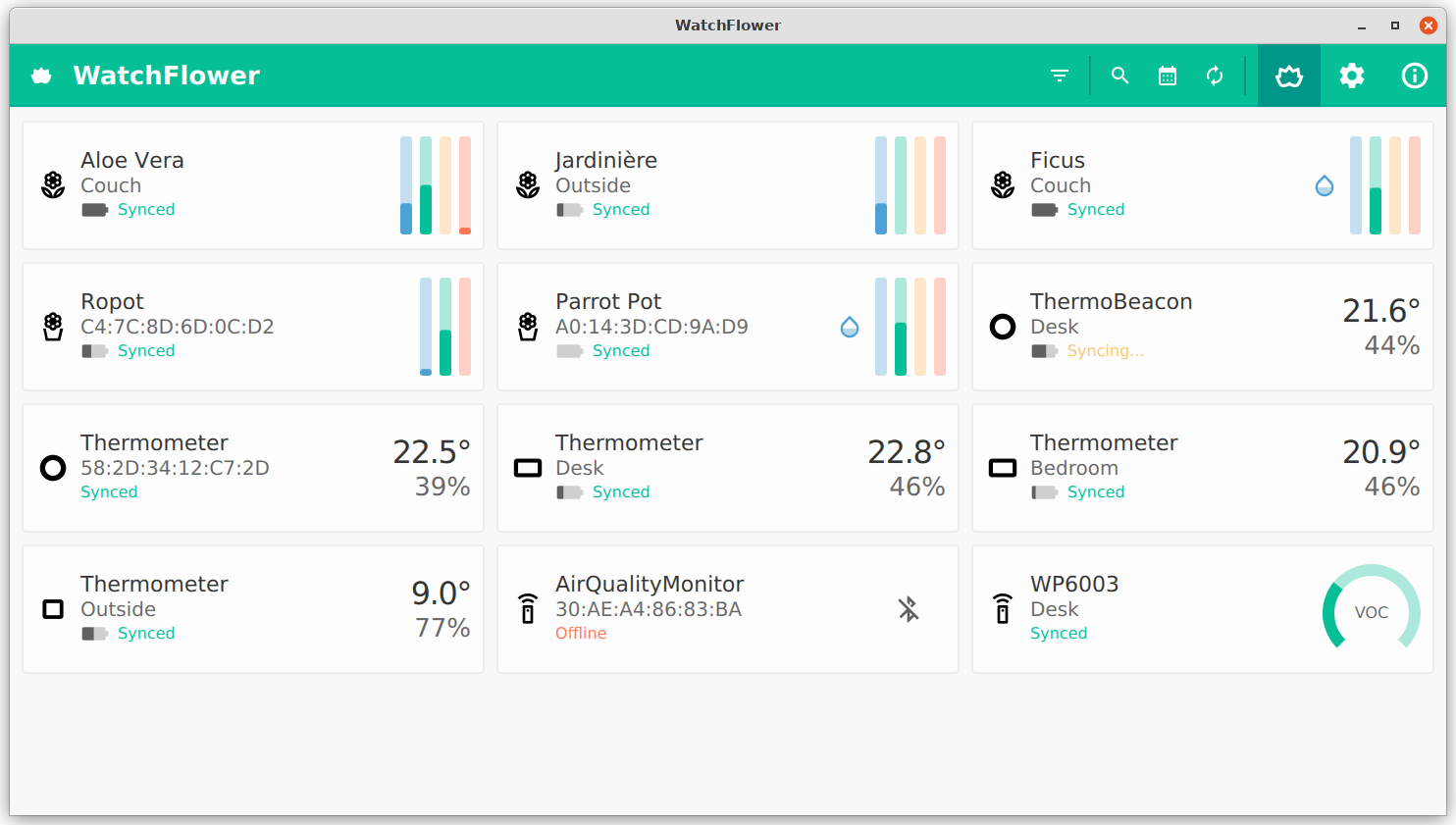 WatchFlower is a plant monitoring application that reads and plots data from compatible Bluetooth sensors like Xiaomi "Flower Care" and "RoPot" or Parrot "Flower Power" and "Parrot Pot", as well as many Bluetooth thermometers! It works with international and Chinese Xiaomi devices, doesn't require an account creation, your GPS location, nor any other personal data from you!