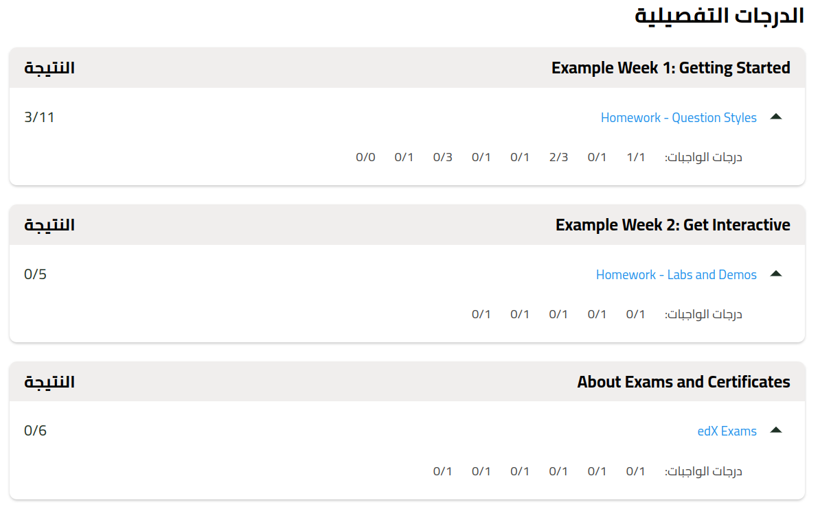 The screenshots show the detailed grades table in the Arabic language for the DemoX course.