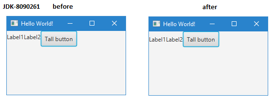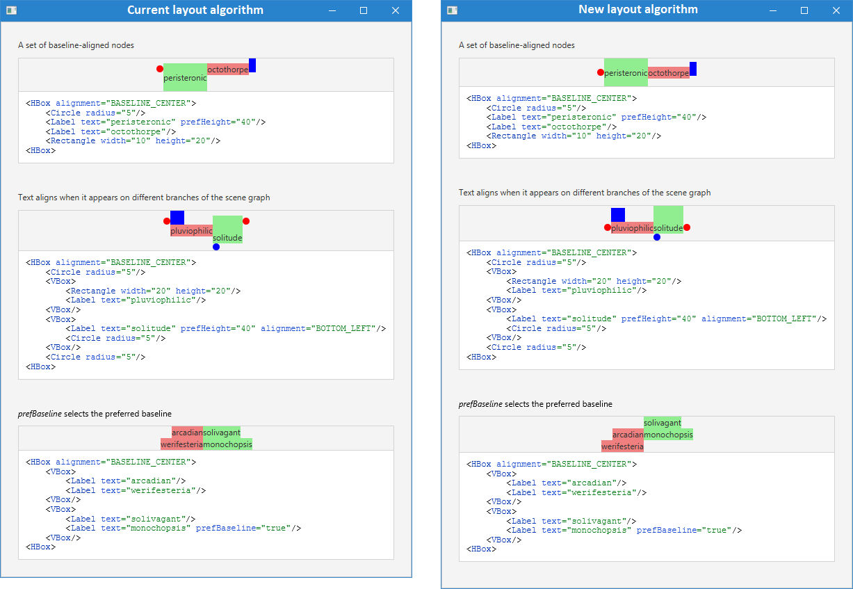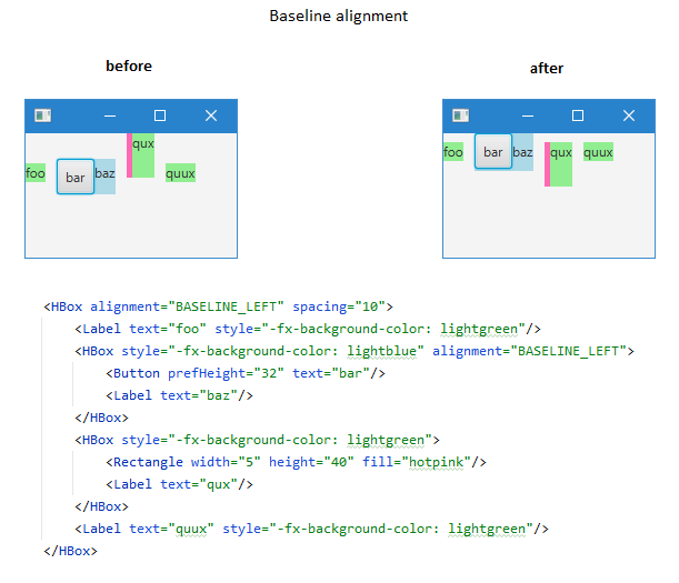 Labeledbefore the control is laid out, we schedule another layout pass when thelayoutYproperty of theTextnode was changed during layout. Repeatedly layouting and measuring the resulting baseline offset will quickly converge to the true baseline offset of theLabeledcontrol. This is the code sample taken from JDK-8090261 before and after the change:Step 2: making baseline layouts more consistent