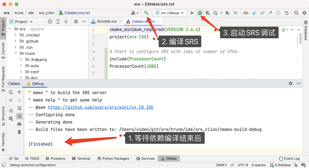 命令,参考: - 点右上角编译、启动或调试SRS,就可以启动调试,对应的是