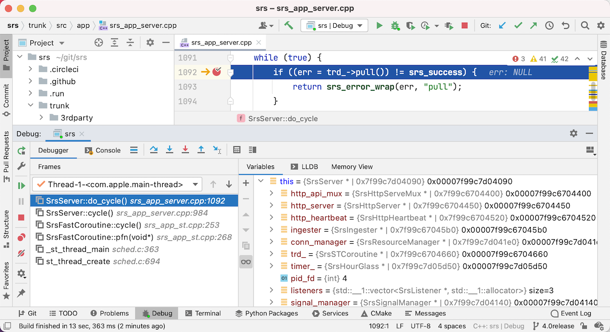 在IDE调试SRS,对新同学是非常友好的,各种信息扑面而来,有种信心大增的错觉: