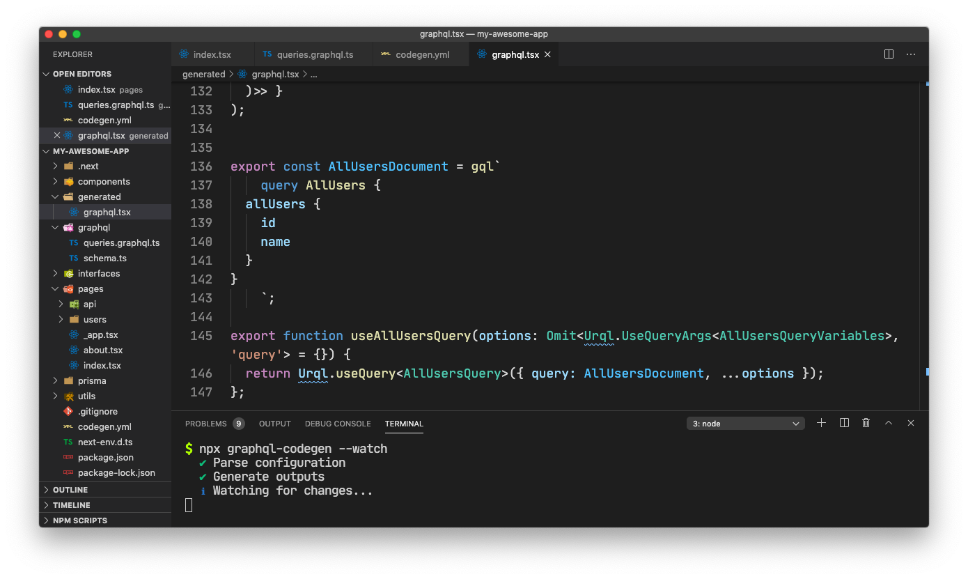 npx graphql-codegen --watchYou will see some nice, written-by-a-robot code in /generated/graphql.tsx. How neat!