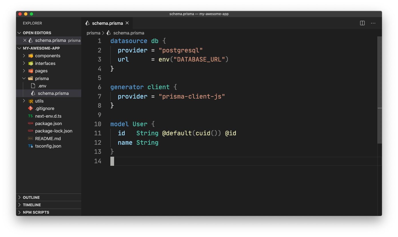 Now, create a starter schema file for Prisma at /prisma/schema.prisma like below: