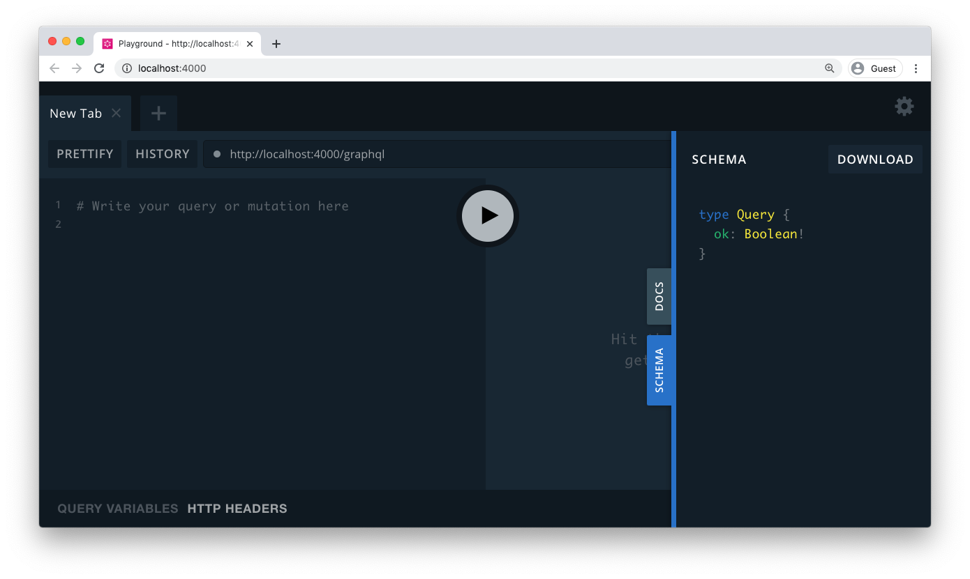 GraphQL Playground with an empty schemaWith the Nexus dev server running in the background and the GraphQL Playground ready at http://localhost:4000, it's time to start implementing the API!