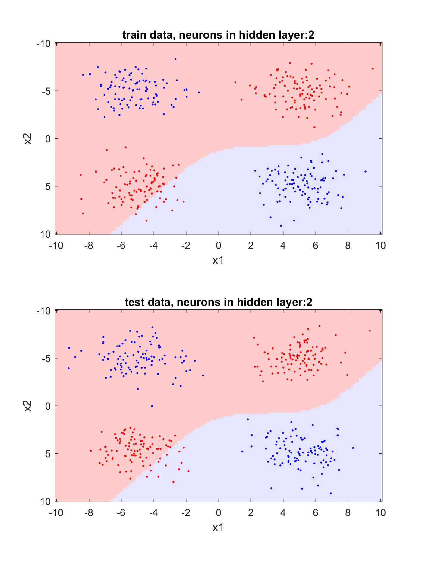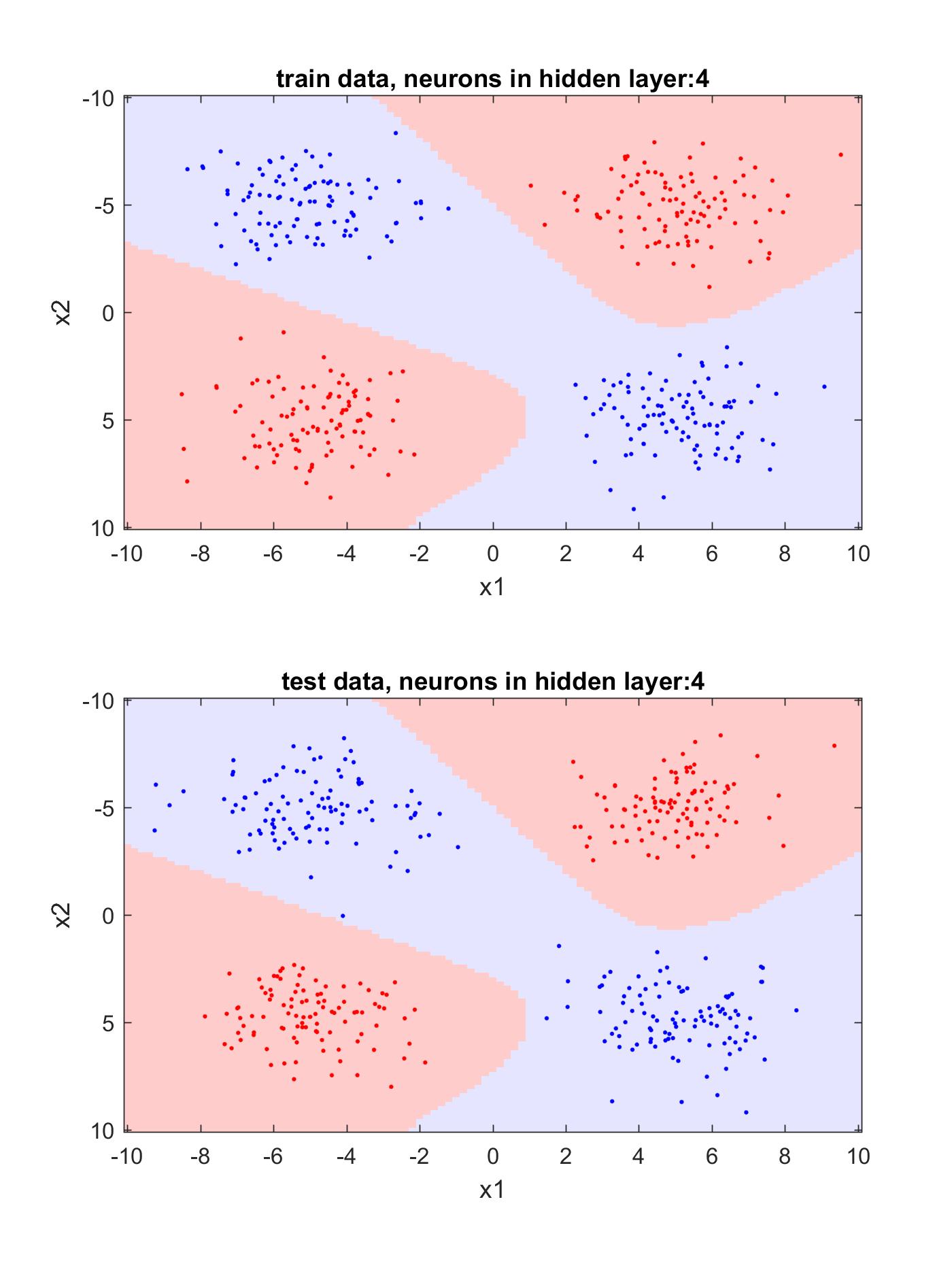 But if the number of nodes increases to 4, the network can classify much better. But this does not mean that as the number of neurons increases, the accuracy of the classification should increase. (As can be seen, 15 neurons in the hidden layer misclassify some data points).