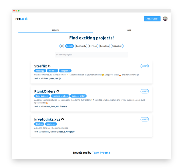 ProStack🔥, is a platform where users can seek for a community of developers who are looking for collaborators to build projects. If any project interests you, get ready for your next open-source contribution, that too with a team.