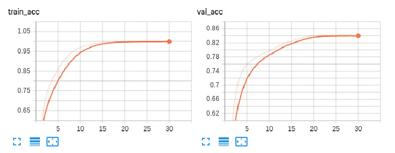 Here is the result of mobilenetv2 , acc ~ 0.84 , after 30 epoches of training