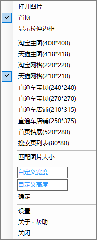 tb-MainImage 淘宝主图测试工具 2018-10-12:v2.0.0 增加常用规格。优化切换大小。 2017-01-11:v1.1.1 美化默认封面。 2017-01-10:v1.1 增加缩放动画。 下载: https://raw.githubusercontent.com/pealpool/tb-MainImage/master/tb%20MainImage%20v18.10.12.exe