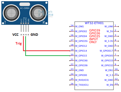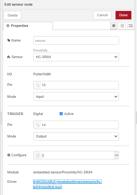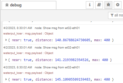 I have my first simple flow running on my WT32-ETH01 board: an inject node sends every 5 seconds a message via an mqtt-out node to Node-RED. That works fine, so I would now like to measure distance using an HC-SR04 ultrasonic sensor: