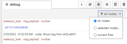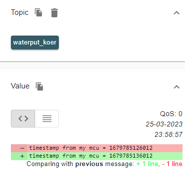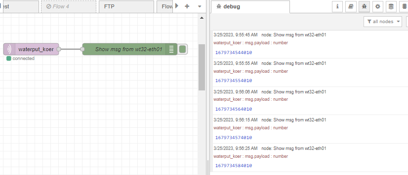 I have added a function node to my flow, which simply adds the prefix "timestamp from my mcu = " to the payload of my messages: And immediately after deploying, that change becomes visible in my MQTT Explorer: Which means my flow is being flashed correctly, and it is running. But still no information from my Debug nodes or the Sensor node. Neither in the Debug sidebar or in the xterm terminal on Ralph's MCU sidebar. BTW all the nodes from my flow are included in the /home/pi/.node-red/mcu-plugin-cache/t5rg16s07b/flows.json file. So my entire flow is correctly in that file. |