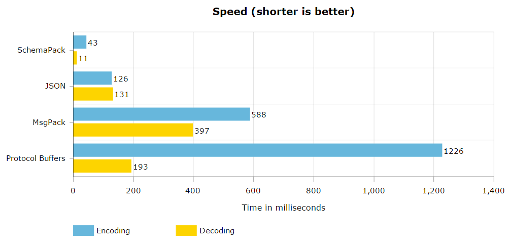 In addition, SchemaPack really shines when used with large objects with a lot of nesting and long arrays compared to the competition. I encourage you to run the benchmarks with your own objects to see what works best for you.