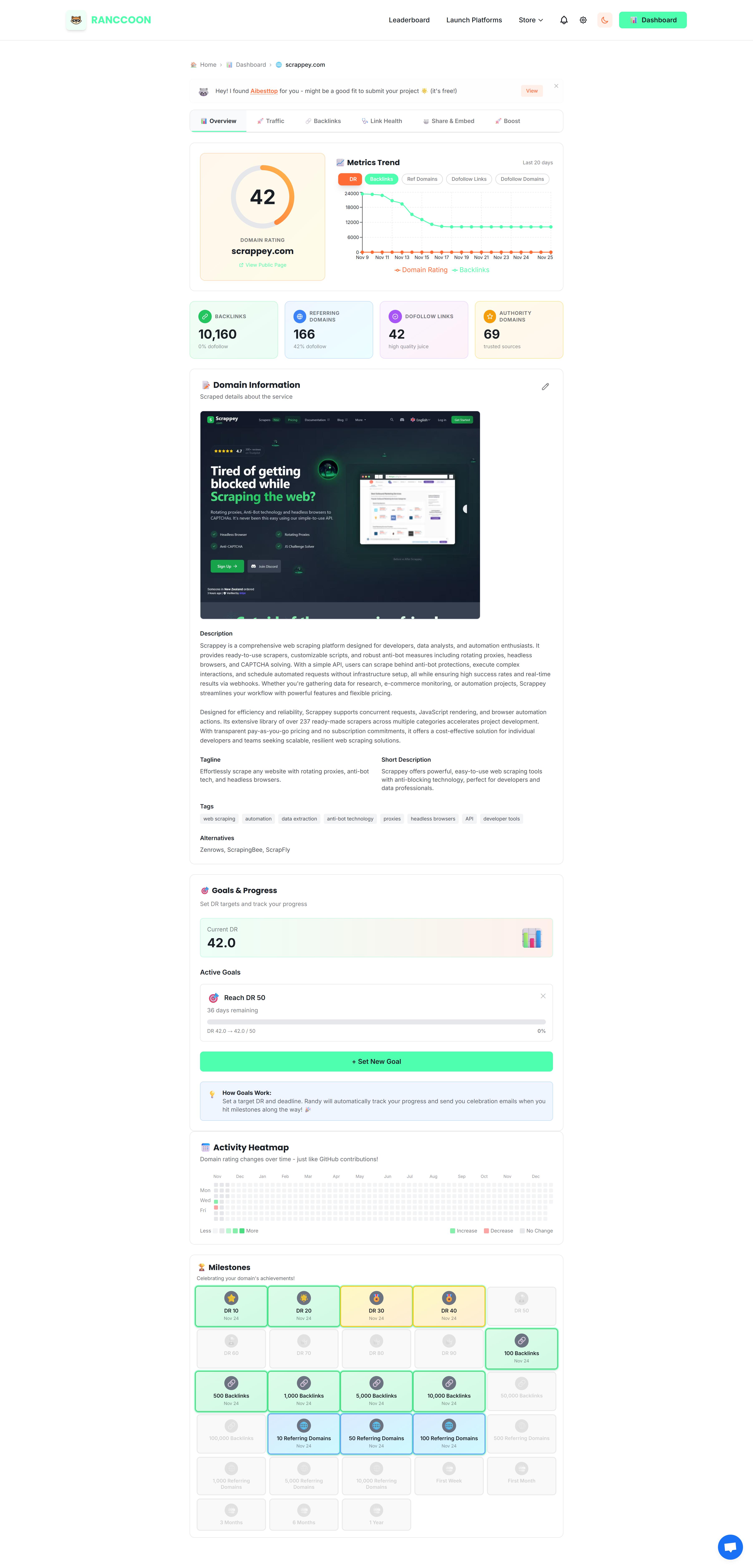 Ranccoon is a free, automated Domain Rating (DR) tracking and monitoring service that helps website owners, SEO professionals, and digital marketers keep track of their domain authority without manual effort. Let Randy the raccoon watch your rankings and backlinks while you focus on growing your business.