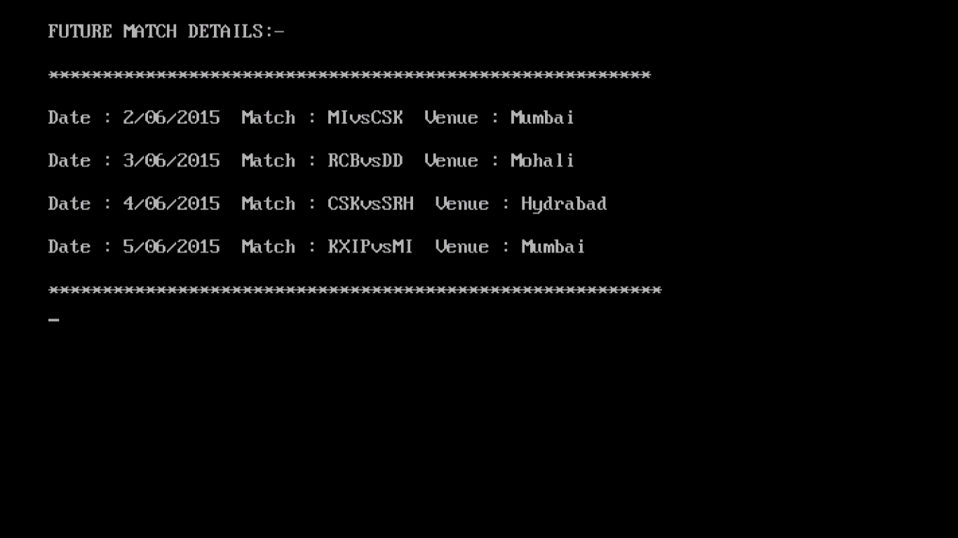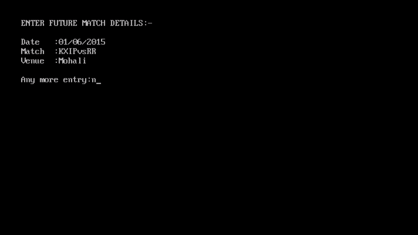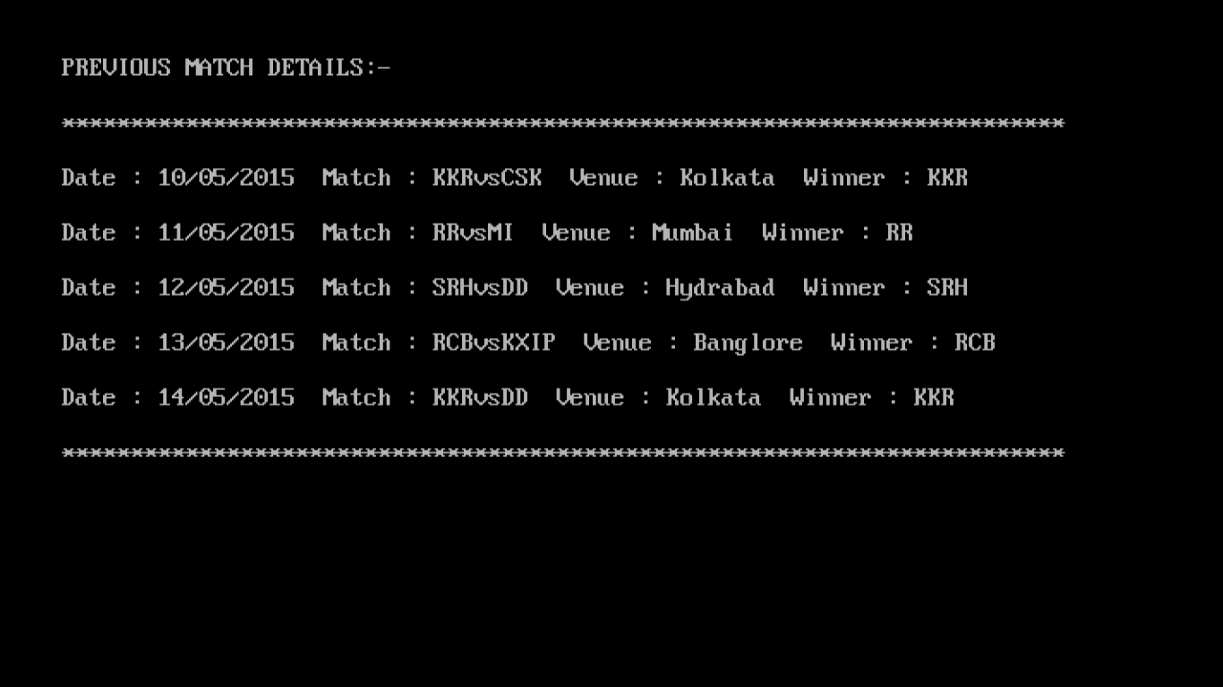 Being a cricket enthusiast, the love for the sport was a major factor why I chose to do my 12th grade final project on “IPL 2015”. In a way I wanted to emulate a data base for IPL 2015 using binary files and OPP concepts in Turbo C++ so that other cricketing enthusiasts like me can use the software to create,retrieve and delete information related to the tournament.