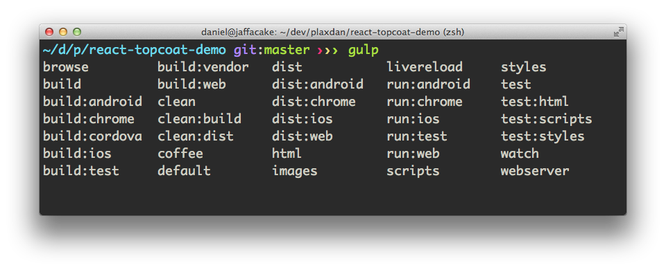 gulp run:testruns mocha tests in consolegulp run:webruns the app athttp://localhost:3000and the mocha test server athttp://localhost:3000/test.htmlgulp run:android[--emulator]runs the androidgulp run:ios[--emulator]runs the ios app