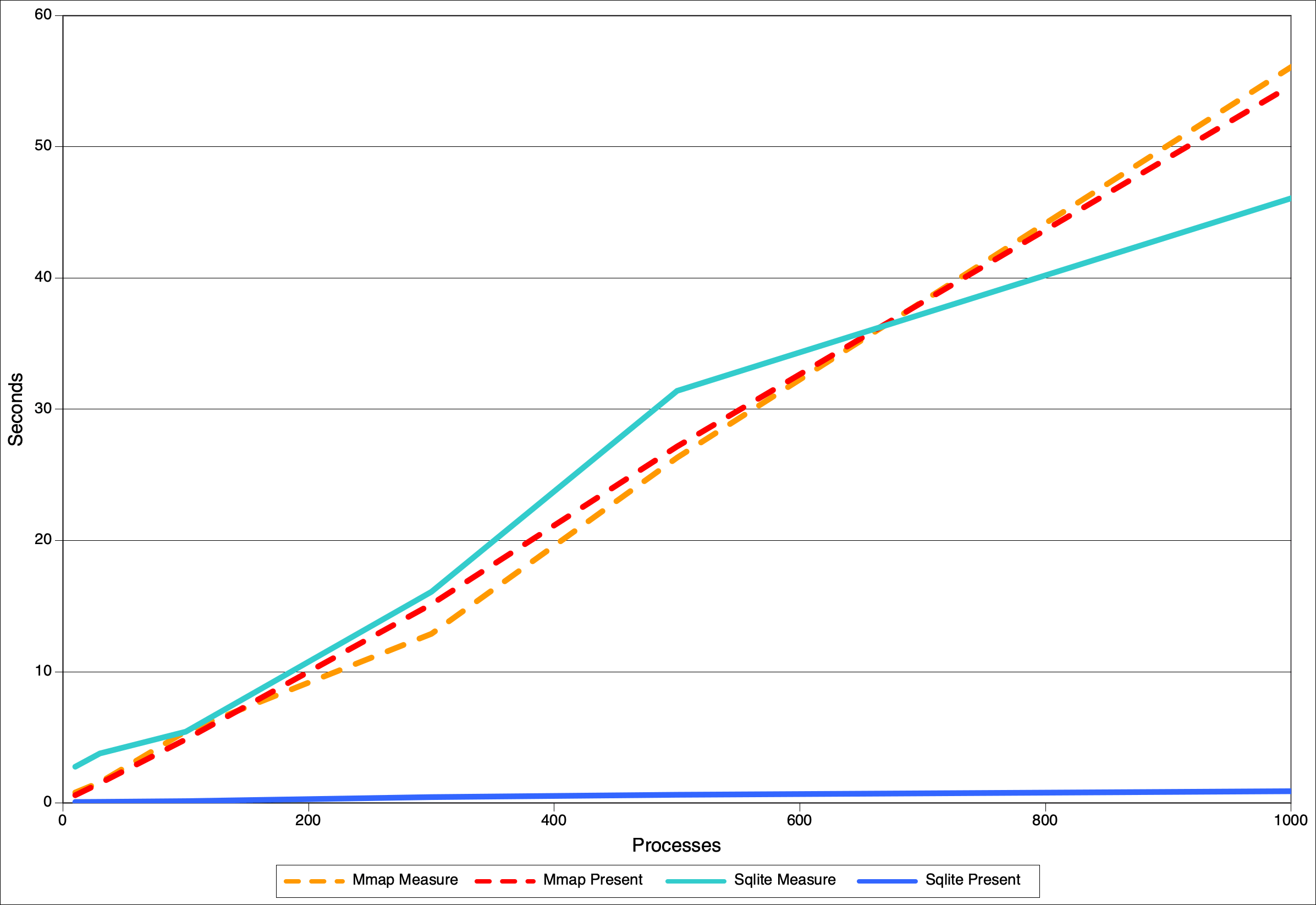 os.getpid()in my test bench, so these numbers could be off in a real-life situation.) See below for results.(Come to think of it, another avenue to investigate, if SQLite is considered too heavy-handed, would be some sort of append-only structure of files that can be easily collated and merged.)