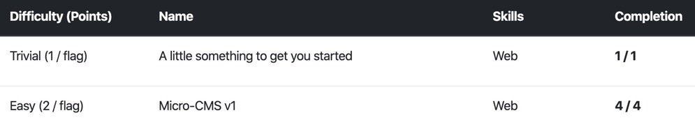 Easy (2 / flag) | Micro-CMS v1 | Web | 4 / 4 | 第01题 |