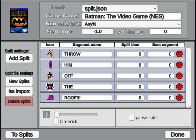 - Limerick mode - In the limerick mode the splits are hidden, and revieled as the run progress. I started doing this as a fun way of doing practice where I want to run the same stage, passage or game over and over for practice. To make it a bit more interesing I wrote limericks instead of just "1, 2, 3" and to engage the audience I thought it could be fun if a limerick was revieled during the run.