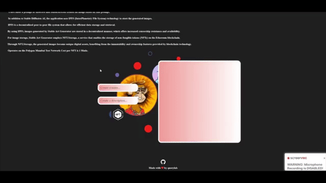 StableArtGen Blockchain is a dApp that uses artificial intelligence technology and smart contracts written in Solidity and Hardhat, along with ReactJS for the user interface. With support for IPFS and nft.storage, it allows users to generate stable images based on user-provided prompts, while integration with Hugging Face and its Stable Diffusion 2 API allows to leverage AI-driven image generation. Requires creating nft.storage and Hugging Face accounts to obtain the respective APIs and using Stable Diffusion 2 to generate AI images.