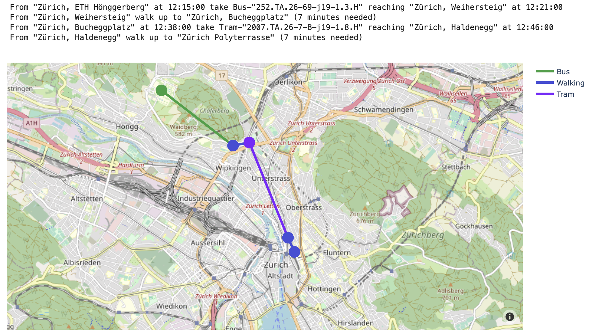 In this final project we built own robust public transport route planner from a SBB dataset. Given a desired arrival time, our route planner will compute the fastest route between departure and arrival stops within a provided confidence tolerance expressed as interquartiles. For instance, "what route from A to B is the fastest at least Q% of the time if I want to arrive at B before instant T". We used the Connection Scan Algorithml, handled data with PySpark and presented resutls with ipywidget.