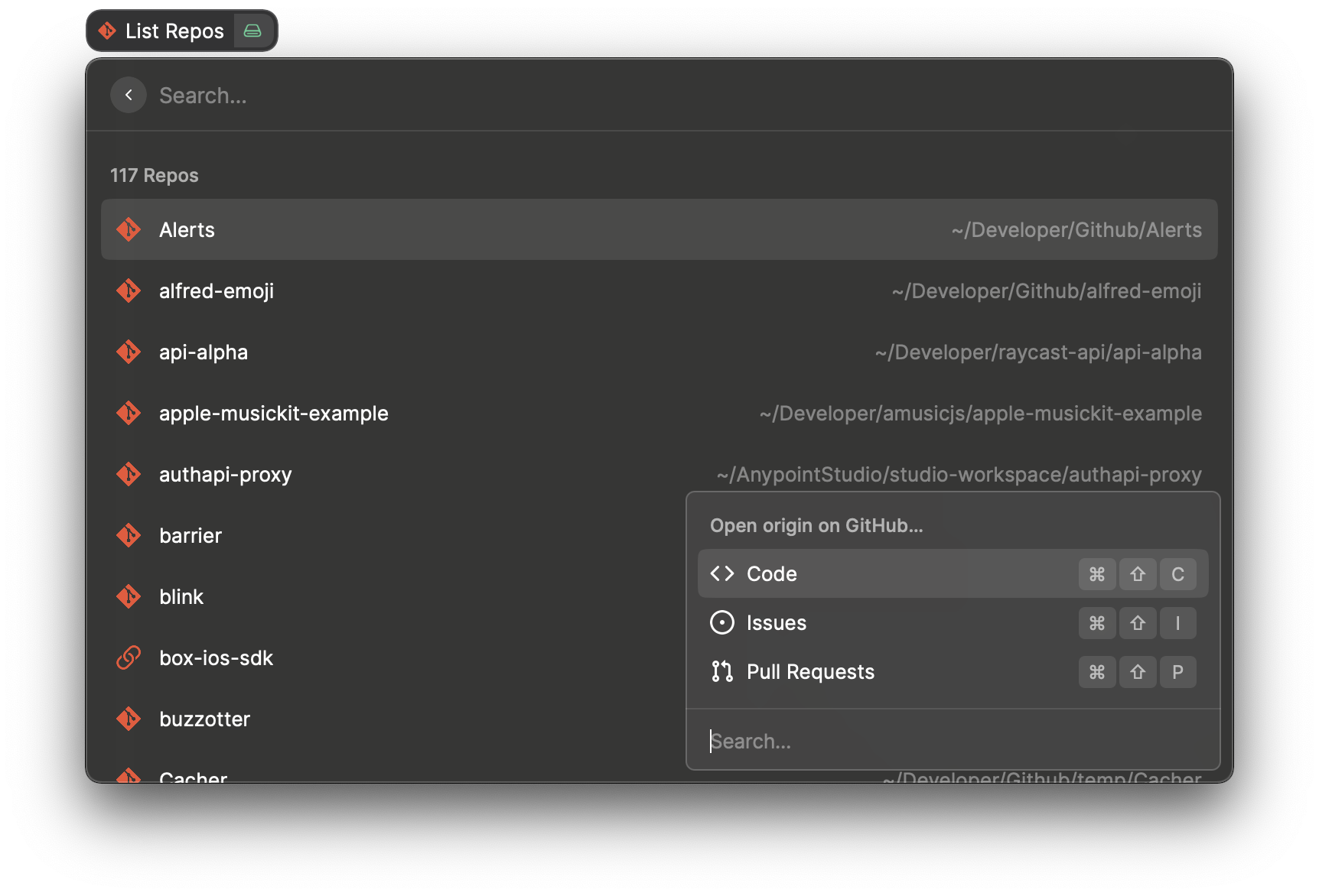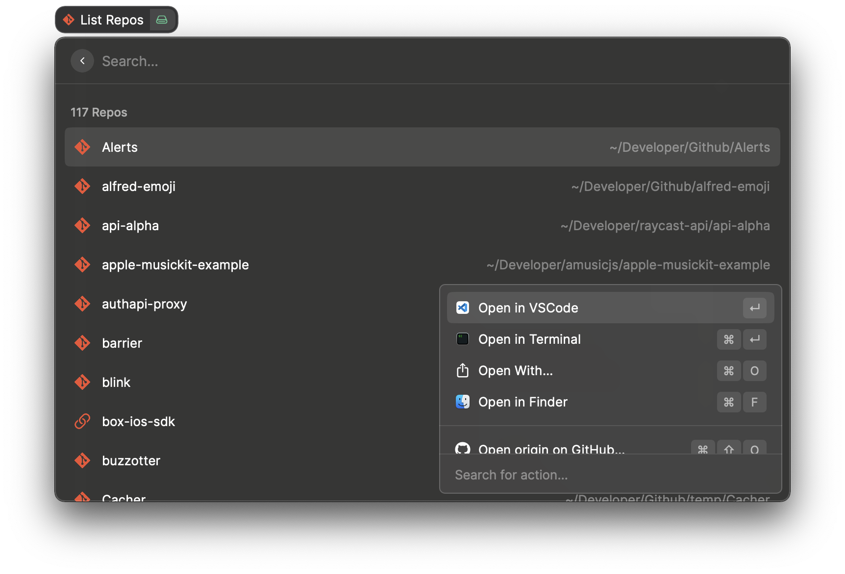 Quickly access your local git repositories and open them in your favorite editor or any app.