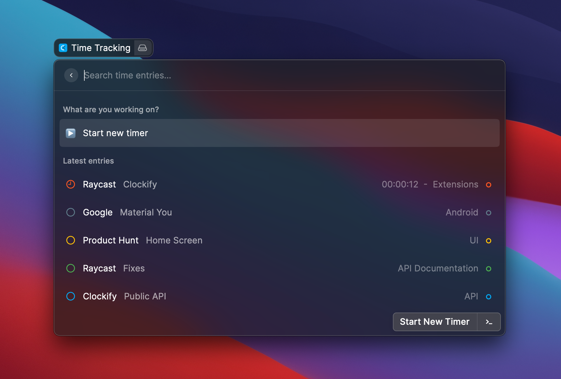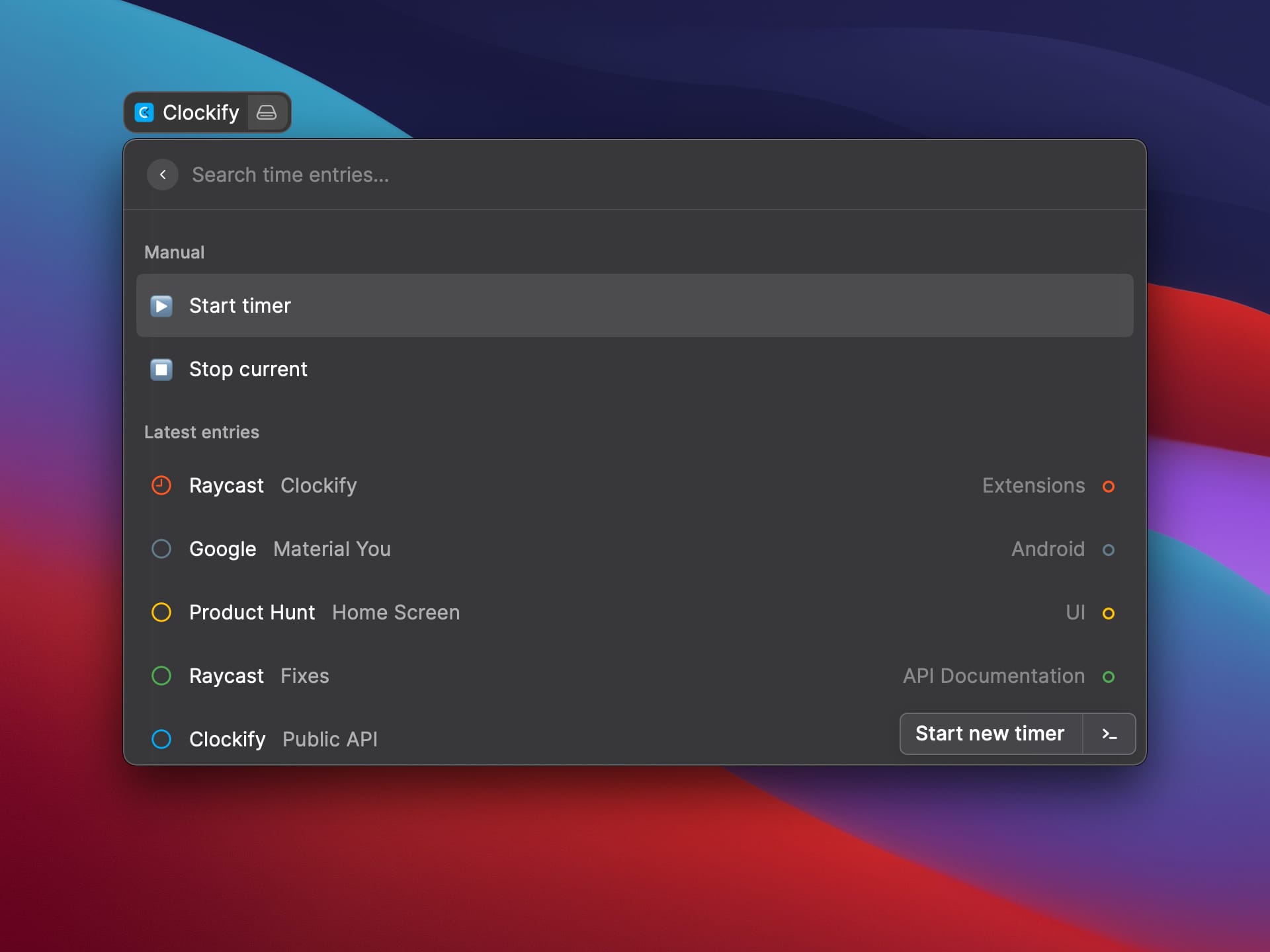 * Add Clockify extension * Update time entries after start or stop a timer * Update extensions/clockify/src/index.tsx Co-authored-by: Per Nielsen Tikær <pnt@klean.dk> * Update extensions/clockify/src/index.tsx Co-authored-by: Per Nielsen Tikær <pnt@klean.dk> * Improve API key validation * Change extension title to Clockify Controls * Update extensions/clockify/package.json Co-authored-by: Per Nielsen Tikær <pnt@klean.dk> * Update extensions/clockify/package.json Co-authored-by: Per Nielsen Tikær <pnt@klean.dk> * Remove Go Back action when token is not valid * Improve way of handle invalid API key * Update extensions/clockify/src/index.tsx Co-authored-by: Per Nielsen Tikær <pnt@klean.dk> * Update extensions/clockify/src/index.tsx Co-authored-by: Per Nielsen Tikær <pnt@klean.dk> * Update extensions/clockify/src/index.tsx Co-authored-by: Per Nielsen Tikær <pnt@klean.dk> * Remove Stop timer option and change section title * Add time elapsed for in progress time entries * Update extensions/clockify/src/index.tsx Co-authored-by: Per Nielsen Tikær <pnt@klean.dk> * Update extensions/clockify/src/index.tsx Co-authored-by: Per Nielsen Tikær <pnt@klean.dk> * Update extensions/clockify/src/index.tsx Co-authored-by: Per Nielsen Tikær <pnt@klean.dk> * Update extensions/clockify/package.json Co-authored-by: Per Nielsen Tikær <pnt@klean.dk> * Rename extension to Clockify and correct author name Co-authored-by: Per Nielsen Tikær <pnt@klean.dk>