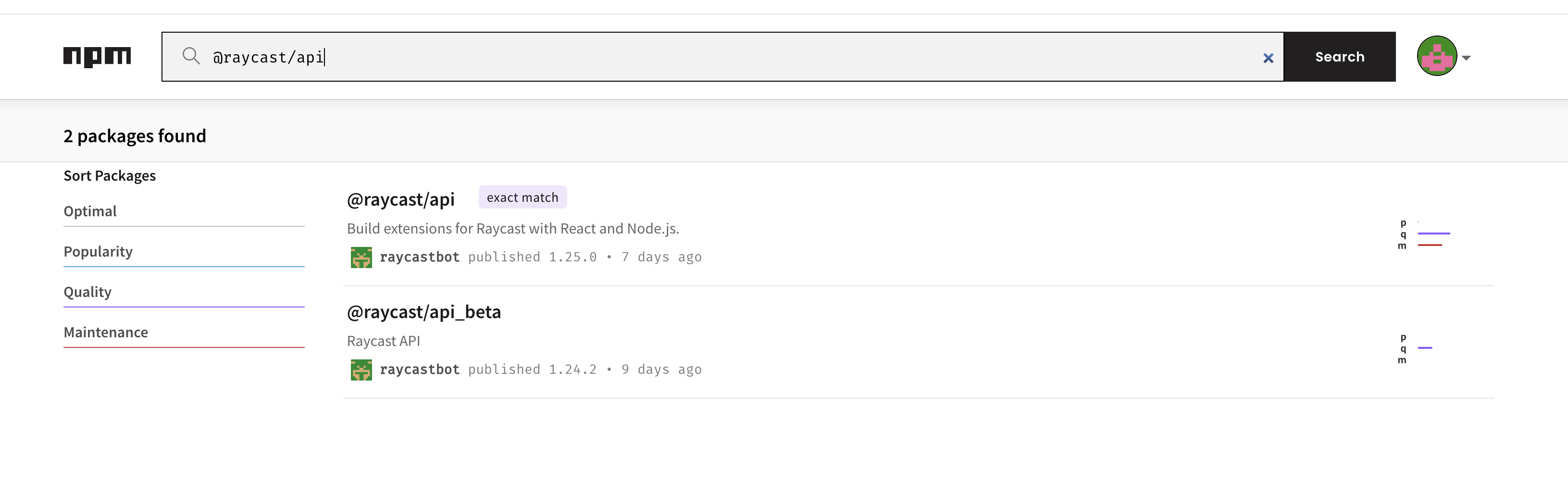 The search is based on npms.io which also does not return any results for that query, see https://npms.io/search?q=%40raycast%2Fapi Perhaps the special chars need to be escaped.. |