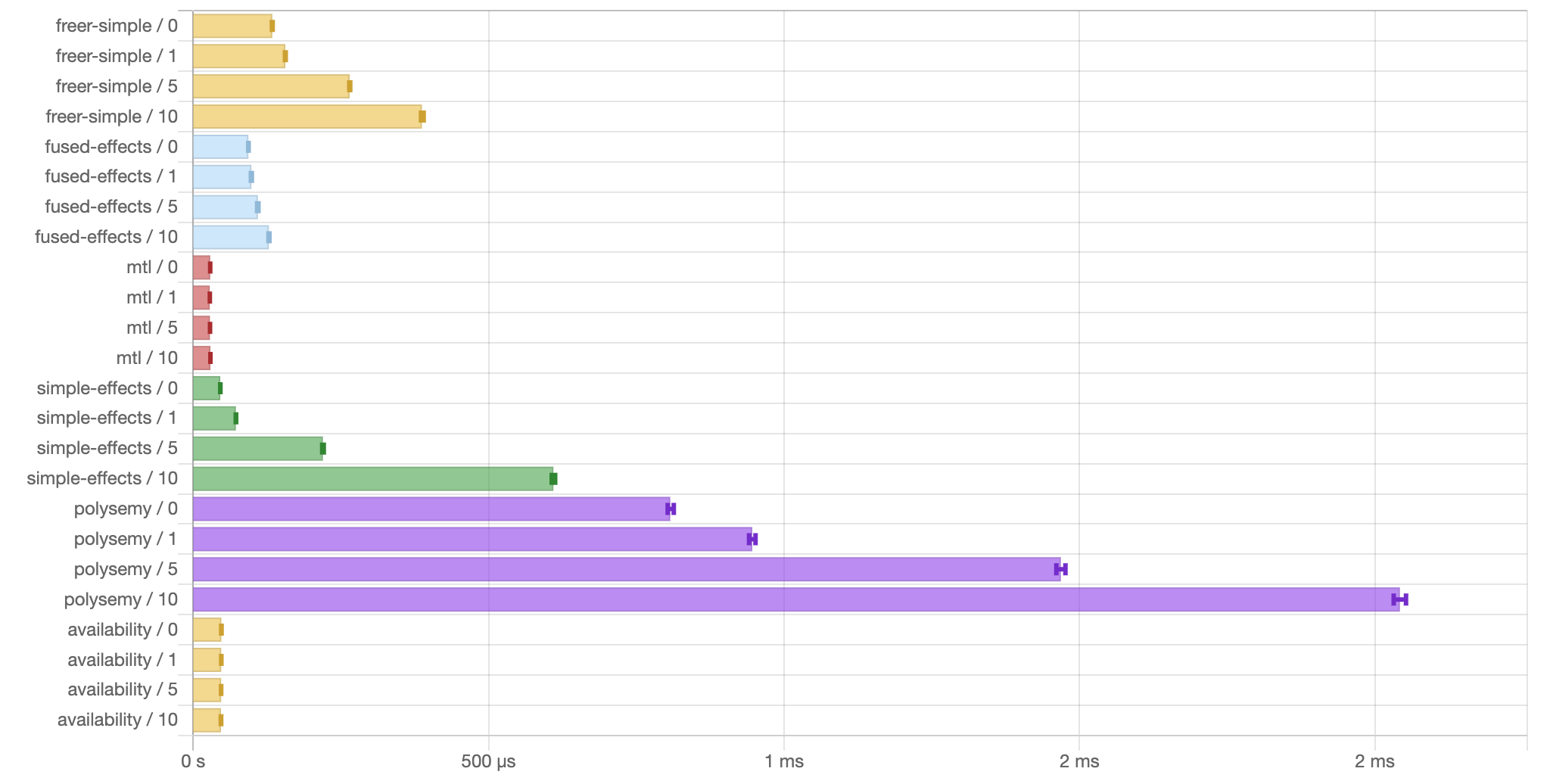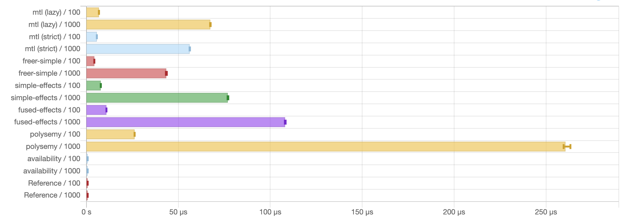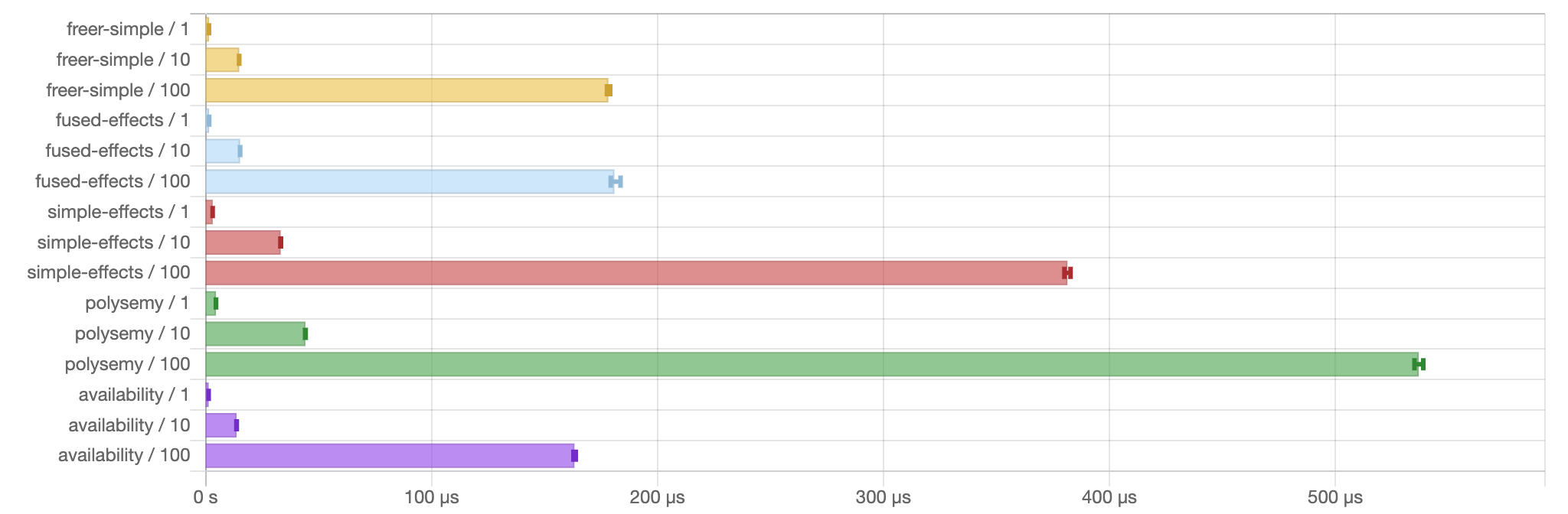 This benchmark interprets multiple layers of no-op effects. availability performed almost identical to mtl. This is because I used mtl to build the underlying monad.