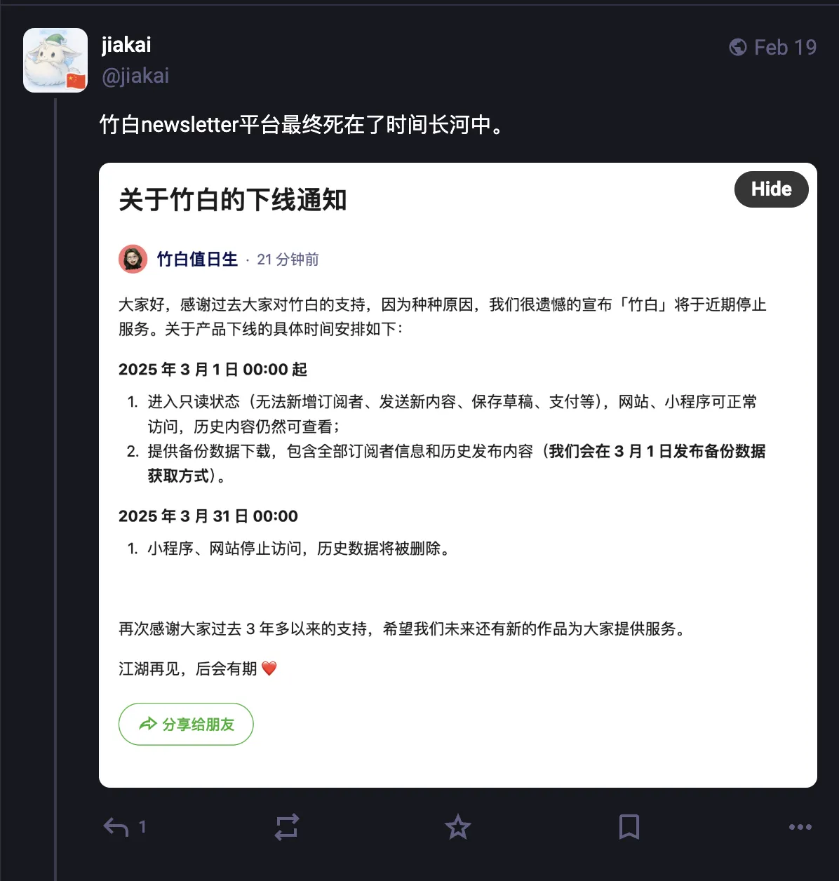 Introduction This repo stores my weekly website source code. Blog theme based on Simple project. Updates 2025.7.23 互联网本质上是脆弱的,2月份当时看到竹白下线我只顾感慨却不想竹白存储了这个站点的一部分文章图片,今天发现后,感慨万千。1~8篇文章图片全部没了。 Acknowledgements Made with ❤️ with Claude Code.